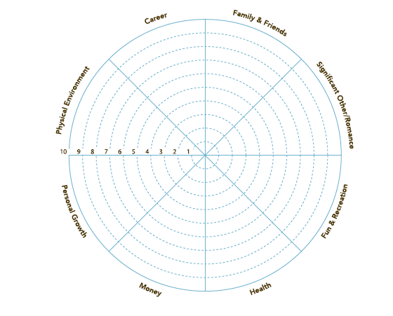 Take a few minutes and examine your own life. Place a line reflecting how satisfied you are (a “10” means you’re 100% satisfied) with each aspect of your life at this time. For example, if you don’t have a significant other in your life and would like a stable, close relationship, you might rate your satisfaction low. But if you aren’t currently interested in putting your energy into a relationship, you might rate your satisfaction a “10.”