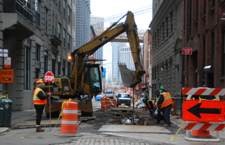 Mounds of dirt. Beeping trucks. Parking blocks away from our house. No water.